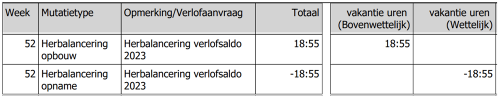 Deze herbalancering van het verlof heeft plaatsgevonden na de laatste uitbetaling van het afgelopen jaar. Op de verlofkaart van 2023 is onderaan expliciet te zien dat er een herbalancering heeft plaatsgevonden.