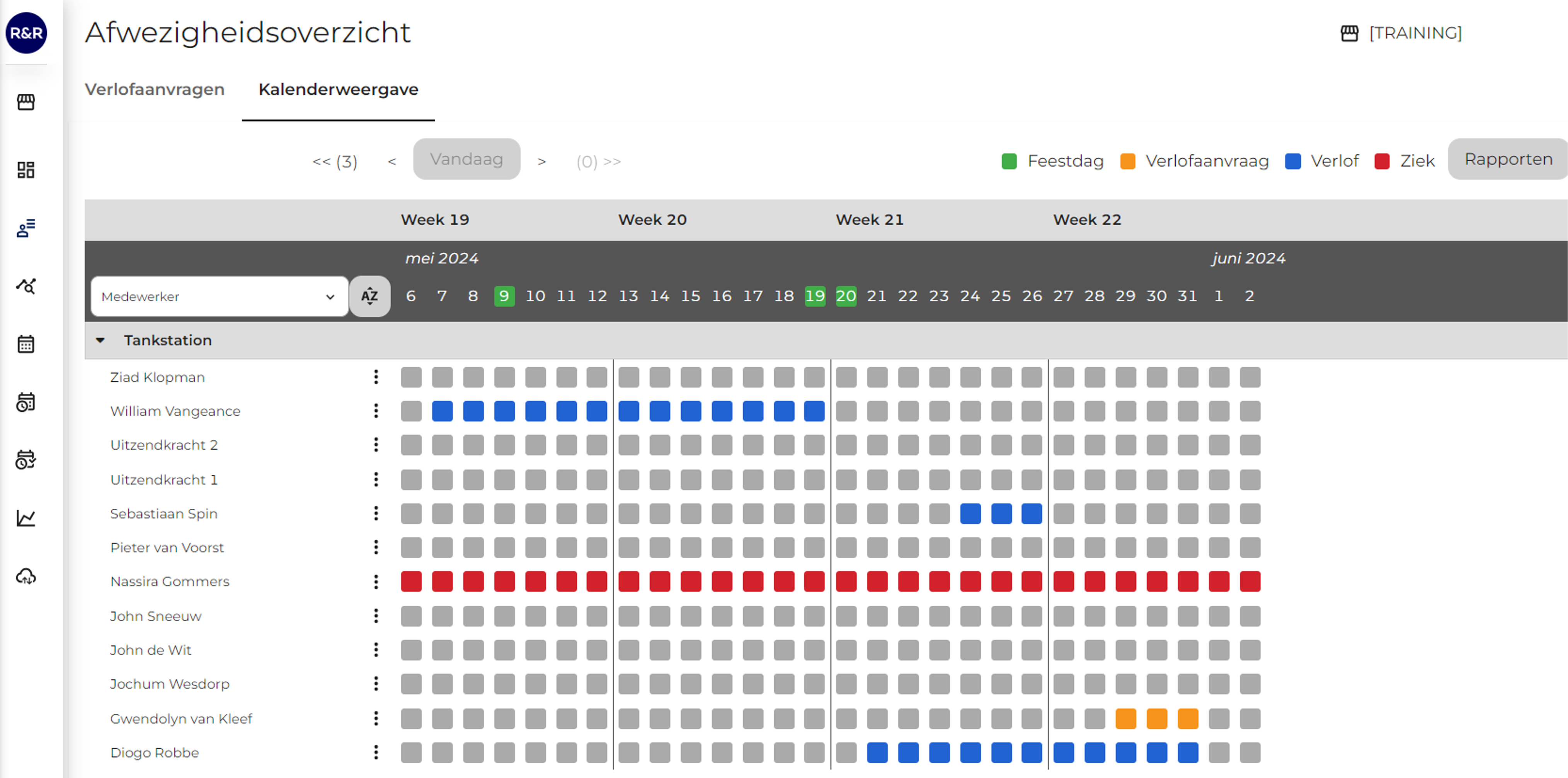 Heb je toch behoefte aan een weergave over een langere periode? Je kunt via de knop ‘Rapporten’ een extra grote weergave van dit scherm downloaden, waarin je verlofaanvragen voor een periode van 27 weken kunt inzien. Met behulp van dit scherm en de rapporten kun je R&R gebruiken om verlofaanvragen goed te beoordelen.